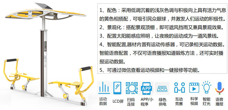 KY.COM-开云(中国)全民健身产品涵盖健身路径、运动场馆、篮乒气羽排等产品,分为多个系列,先进的制造工艺、严苛的质量检测,确保产品性能优良、品质安全可靠,让运动简单科学。并将全民健身器材(户外路径器材、体育场馆等产品)进行智能化升级和互联,实现全人群覆盖、全场景智能,让运动赞美生活。