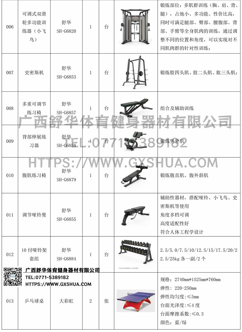 史密斯机(1台),多重可调节练习椅(1台),腹肌训练器(1台),10付哑铃套组(1套),可调哑铃凳(1张),可以实现对不同肌肉群的针对性训练,满足肌肉训练需求,全方位激活身体机能。