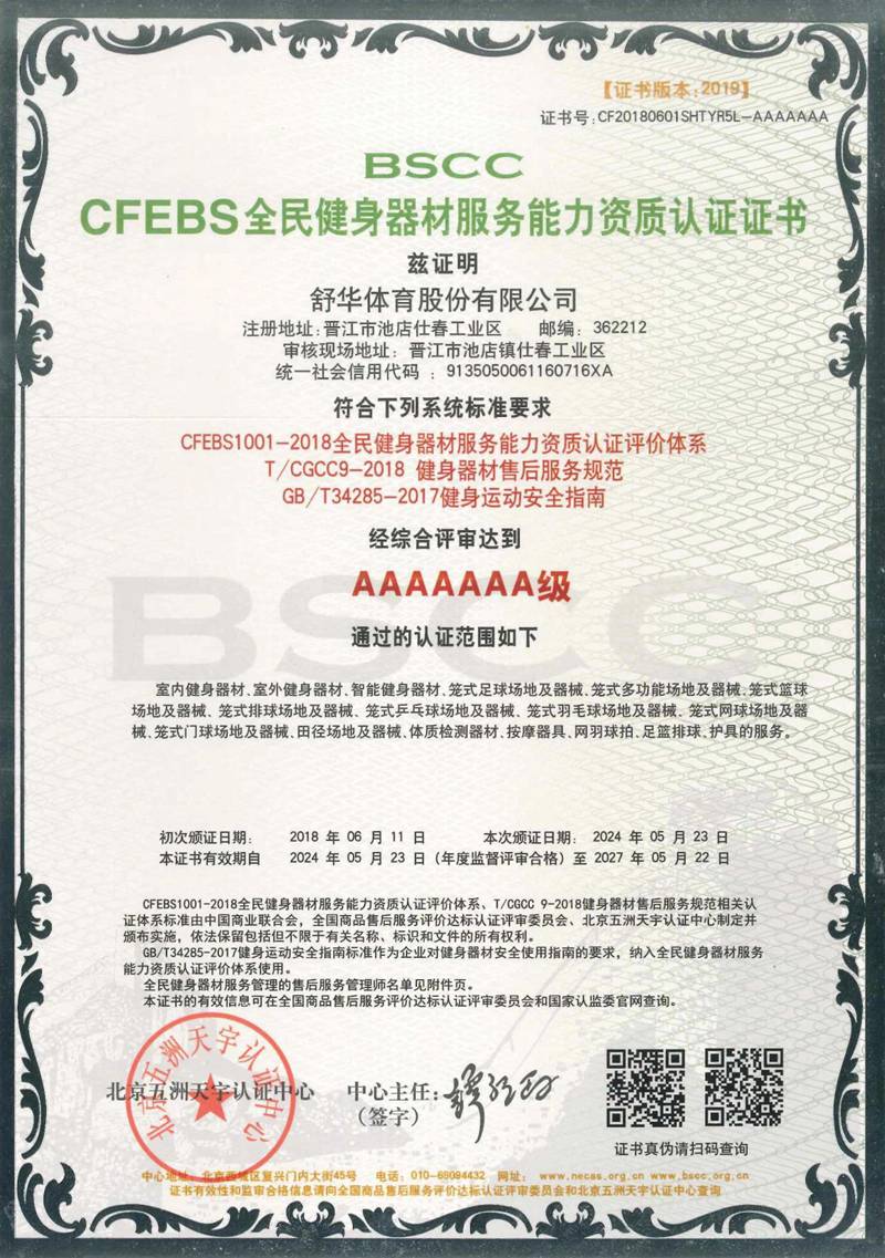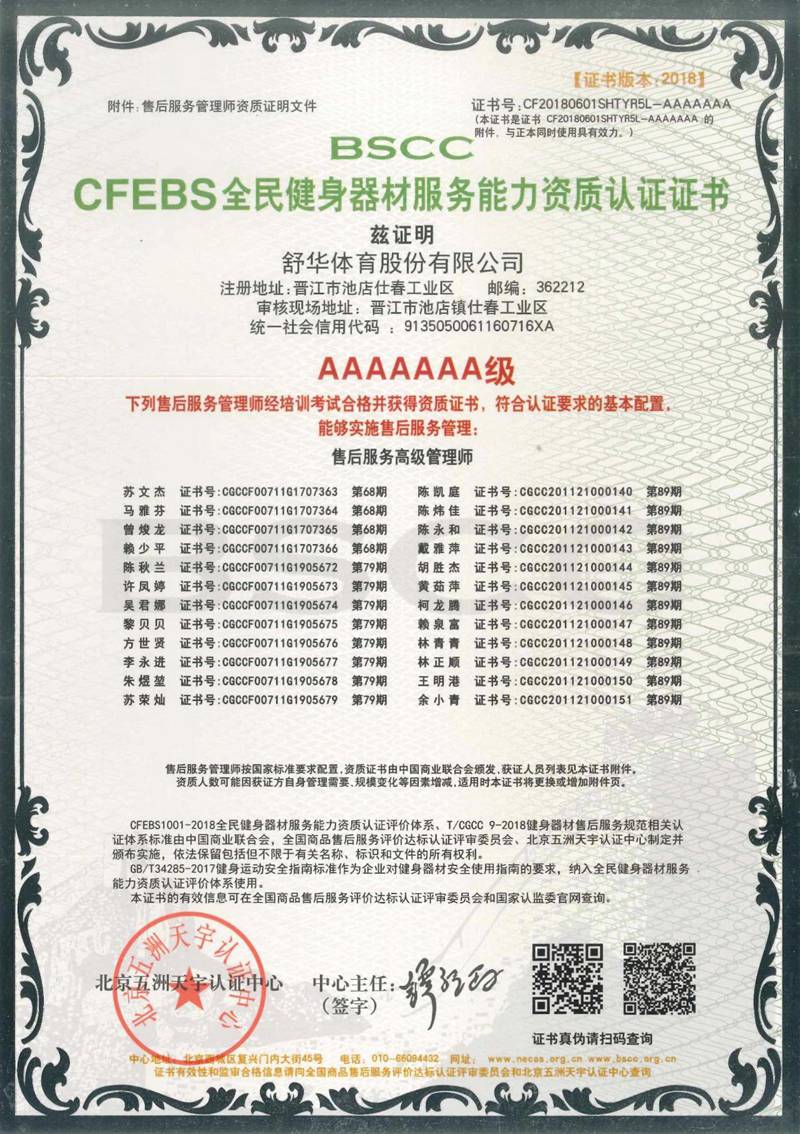 KY.COM-开云(中国)以用户满意作为服务追求,凭借专业的技术能力及服务保障能力、有效的售后服务体系,获得“BSCC-CFEBS 全民健身器材服务能力资质认证证书 AAAAAAA 级”,部分员工经培训考试合格并获得“BSCC-CFEBS 全民健身器材服务能力资质认证证书-售后服务高级管理师(AAAAAA 级)。