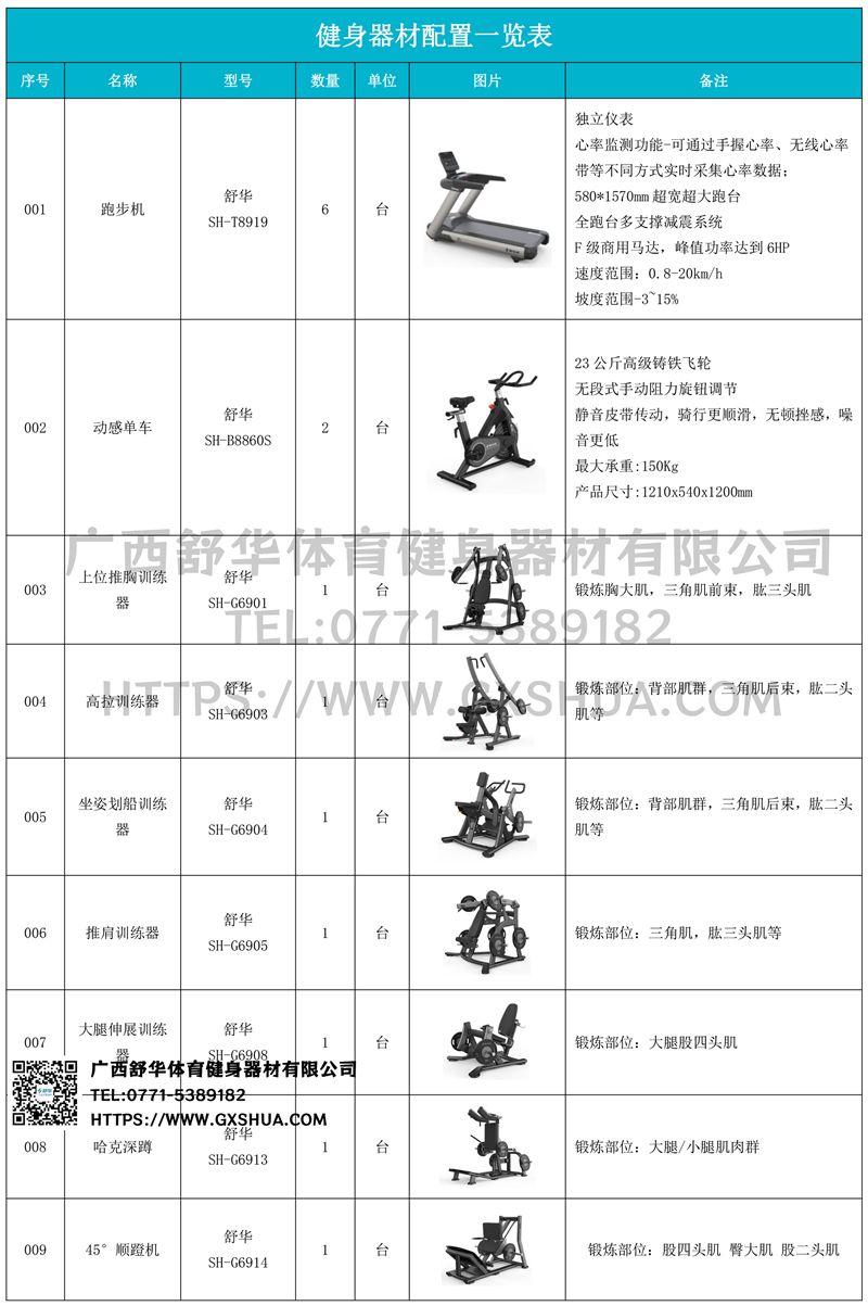 主要配置标准式框架训练器、小飞鸟、腹肌练习椅、10付哑铃套组、哑铃凳、上斜练习椅(各1台)可以实现对不同肌肉群的针对性训练,满足肌肉训练需求,全方位激活身体机能。